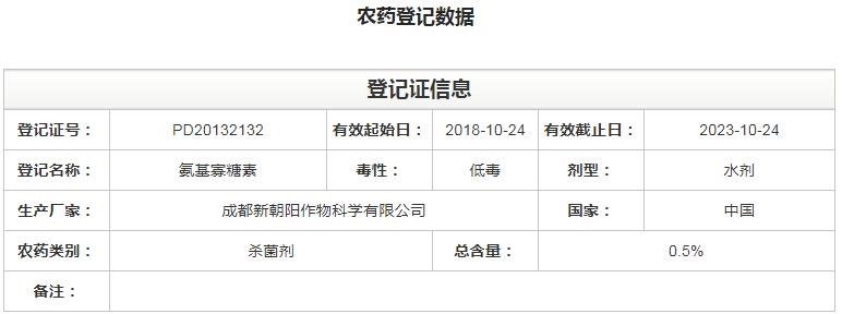 據(jù)了解,截止2018年12月,氨基寡糖素在中國農(nóng)藥信息網(wǎng)登記信息共計77條,有效成分含量從0.5%-5%不等,主要以殺菌劑為主。而目前國內(nèi)將氨基寡糖素定位在防治根結(jié)線蟲上的僅有兩家企業(yè),最早登記的是成都新朝陽作物科學(xué)有限公司。新朝陽0.5%氨基寡糖素水劑(茛互)是國內(nèi)第一個生物源根結(jié)線蟲防治合劑。