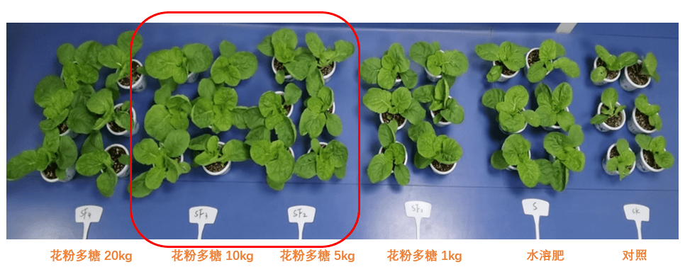 (2)根據(jù)復合肥施用量,設計減量復合肥20%,同時進行不同用量花粉多糖復配,即全量肥(60kg/畝)、減量肥(48kg/畝)、減量復配花粉多糖3、5、10kg/t。通過測試發(fā)現(xiàn),相比全量復合肥處理,減量+花粉多糖10kg/t處理后,小白菜地上部分鮮重、根長、根重、冠幅、葉長、葉寬分別增加26.5%、42.2%、123.8%、7.7%、1.6%、9.3%,促進效果明顯。結(jié)合成本計算,減量后添加花粉多糖可達到降本增效的目的。